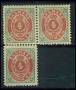 1870. 4 sk. grå/rød i 3-blok, nedre mærke sammenholdt med hængsel.