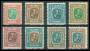 1907. 5 aur grøn i 4-stribe med beskrevne varianter.