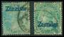 ZANZIBAR. 1895. ½ A. blåt overtryk samt 2,6 p variant begge forfalskninger.