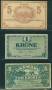 1 Krone 1918 L 5463461, 5 Kroner 1942 J 0532353 og 5 Andele 1. serie Litra B